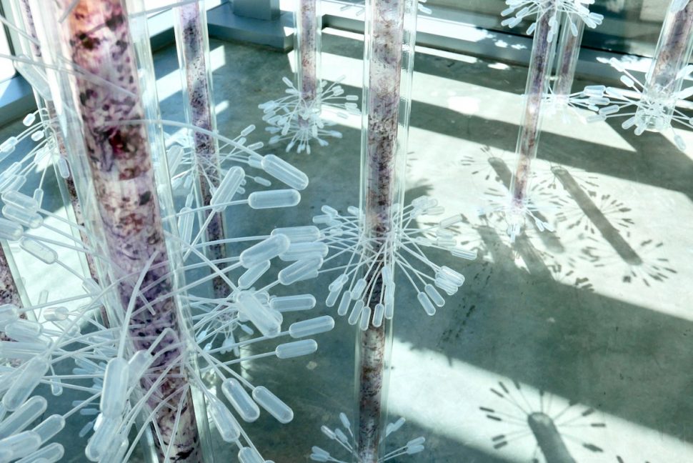 For Transfer, Pae Yang captured images under a microscope, collecting specimens and photographing them with a DSLR attachment. She printed and layered the images onto the tube structures, connecting clustered pipettes to resemble nature’s growth systems.