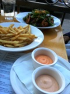 I ordered a glass of their Tempranillo and was not disappointed with the nice bold flavor of this red wine. The waitress was quite friendly as she took our order and very attentive throughout our meal. Alyssa ordered the Pommes Frites and their Spicy Shrimp Salad and I ordered the Ahi Tuna Tartare to accompany my wine.