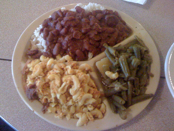 We found a seat and started to peruse the menu. It did not take long for me to find the meatloaf and if you know me, that is what I am going to have. Meatloaf out is not always a good choice (and rarely does it even come close to what I make), but being at a soul food establishment and seeing the order on the guy’s plate behind me was convincing enough for my judgment. Taylor decided on the Smothered Chicken which was two very large legs and one thigh of southern fried chicken covered in a very thick and rich brown gravy. Both of our meals came with three different sides and two cornbread muffins each. I chose the Mac and Cheese, Collard Greens, and Red Beans and Rice. Taylor’s selection substituted Green Beans for the Collard Greens, but followed suit on the rest.