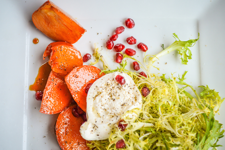 The persimmon and baby endive salad with burrata and pomegranate seeds.