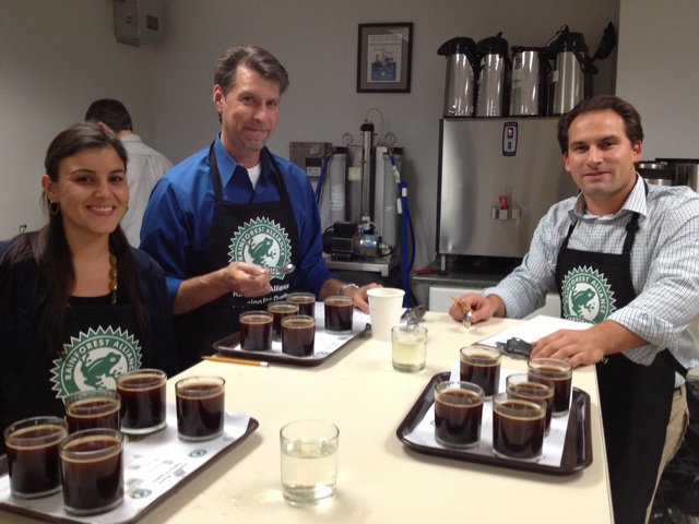 Cuppers Yesenia Villota, InterAmerican (left); Adam Kline, Atlantic Specialty (center); Jay Isais, International Coffee & Tea/Coffee Bean & Tea Leaf (right). Photo courtesy of Rainforest Alliance.