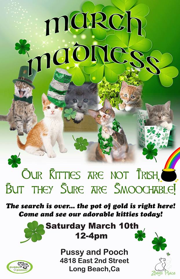 Are you feline lucky? Lots of little leprekitties from this great rescue will be waiting to go home with you, and Zoey’s Place’s new spring merchandise will be available. For a St. Paddy’s switch, grant these good little creatures a wish instead of the other way around. You’ll find that yours have all come true with an adoptable kitty!