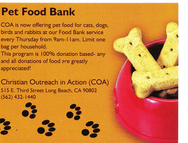 The Pet Food Bank is sponsored by Christian Outreach in Action http://www.coalongbeach.org/about/. COA is located at 515 E 3rd St, Long Beach. Hours are Thursday from 9:00AM to 11:00AM.