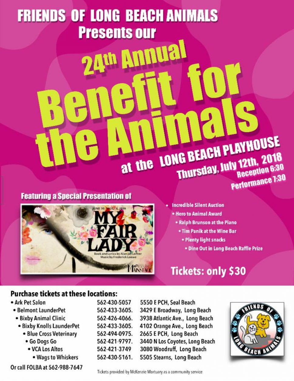 The rain in Spain they’ll track in your domain…by George, you’ve got it—a wonderful time viewing the classical musical My Fair Lady, enjoying a buffet of goodies, bidding on auction items, listening to the piano music, and of course, we won’t forget helping all the pets that Friends of Long Beach Animals (FOLBA) helps spay and neuter and provide for! Tickets are can be purchased at the locations on the flier, or you can call FOLBA directly at (562) 988-7647. And be sure to get you to the show…on…time!