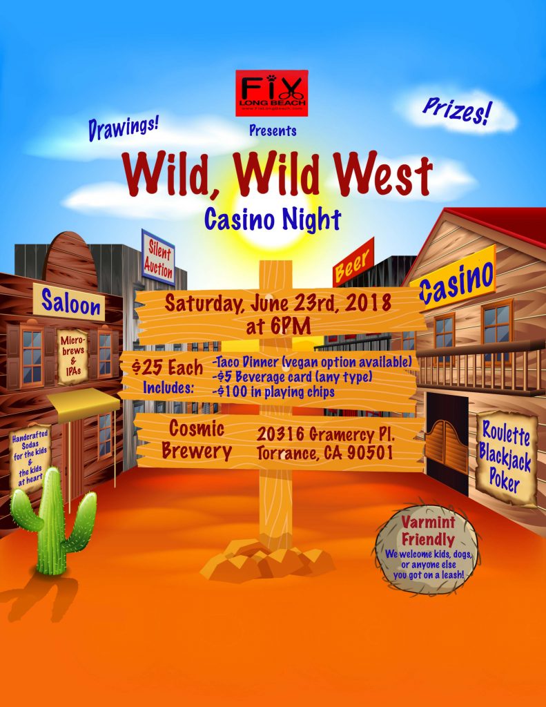 Git along, little doggie–uh, dogie, and we’ll lasso up some great food, drinks, sounds and lots of yee-haw fun! Your $25 will grab you a taco dinner (we have vegan options for cowpokes who don’t like to poke cows), mighty fine craft beers and handcrafted soda pop. Don’t tell the sheriff, but we’re giving you $100 in “funny money” that you can use in the ol’ saloon playing roulette, poker and blackjack. And y’all can absquatulate with some durn fine prizes from gaming and in the silent auction (you gotta spend actual tin for that). Best of all, you’ll be helping us round up pets to spay and neuter—Fix Long Beach does that for free for folks who can’t afford it–all the greenbacks you spend will be used at Fix Long Beach!