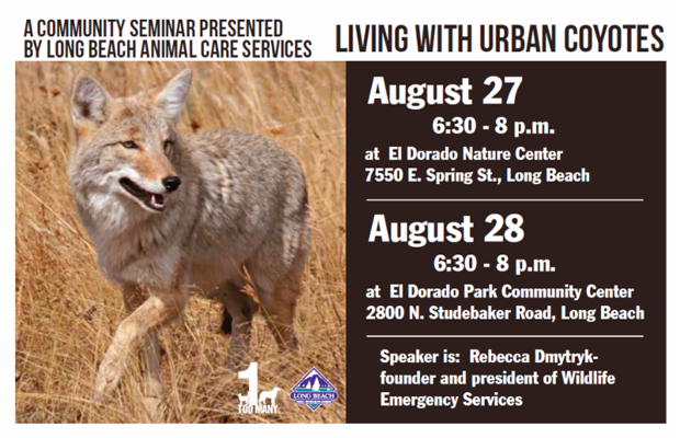 In this light, ACS will present a community seminar, “Living with Urban Coyotes,” which addresses the education component of both the management plan and the proposed mitigation plan. The sessions will be held on Thursday, August 27, at the El Dorado Nature Center, 7550 East Spring Street, and on Friday, August 29, at the El Dorado Park Community Center, 2800 North Studebaker Road. Both will take place from 6:30PM–8:30PM.