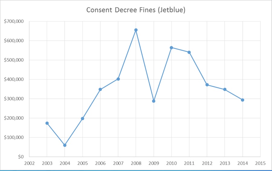 In fact, the airport has entered into a revolving Consent Decree that installed a escalating fine system in place of having to file and prosecute criminal actions against the airline. The first six violations of a given quarter are charged at $3,000 each, with every violation above six costing JetBlue $6,000, all of which goes toward supporting city libraries. The company, which is on pace to owe around $300,000 in fines for 2014, hit a peak in 2008 when its fines nearly reached $700,000. In total, JetBlue has paid over $4 million in fines since 2003, when the decree was put in place.