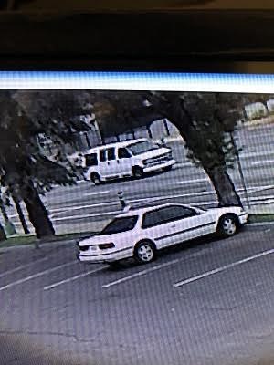 The suspect vehicle is described as a white 1996-2000 Chevy Express Passenger Van with windows all around. The window behind the driver has a sun shade with an upside down Honda logo and the back window of the van has a red “Temporary Registration” card with a white No. 6 on it. The vehicle’s plate has a decorative plate with “FMU” on it in possibly white and red.