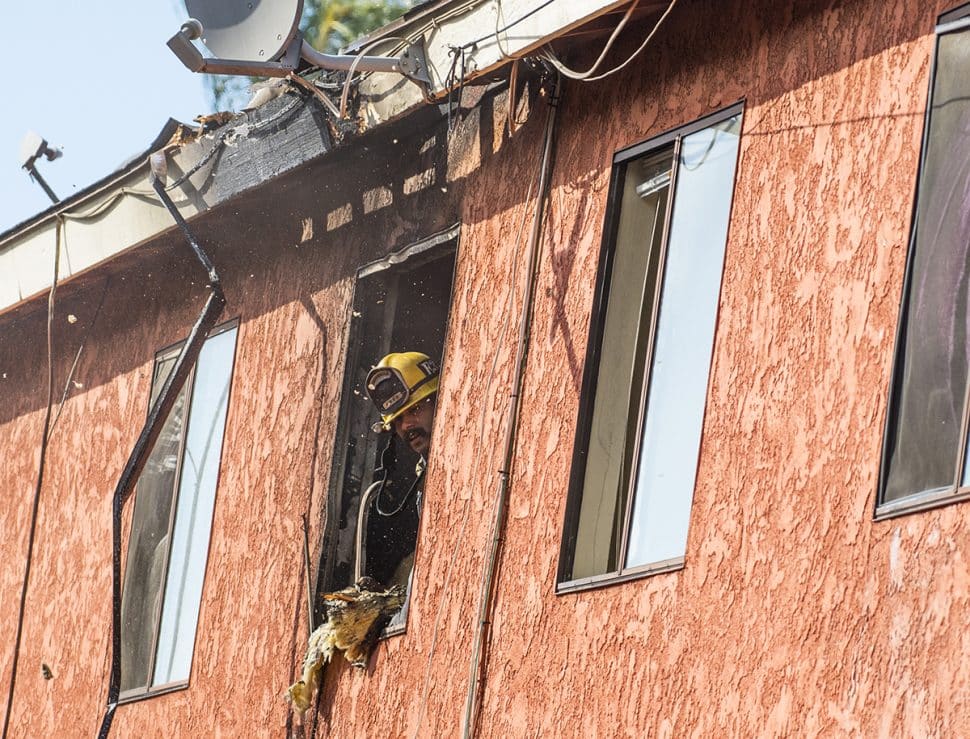 A firefighter looks out the burnt-out bedroom window after Long Beach firefighters put out the fire in a second-story room in Long Beach, October 29, 2018. Photo by Thomas R Cordova.