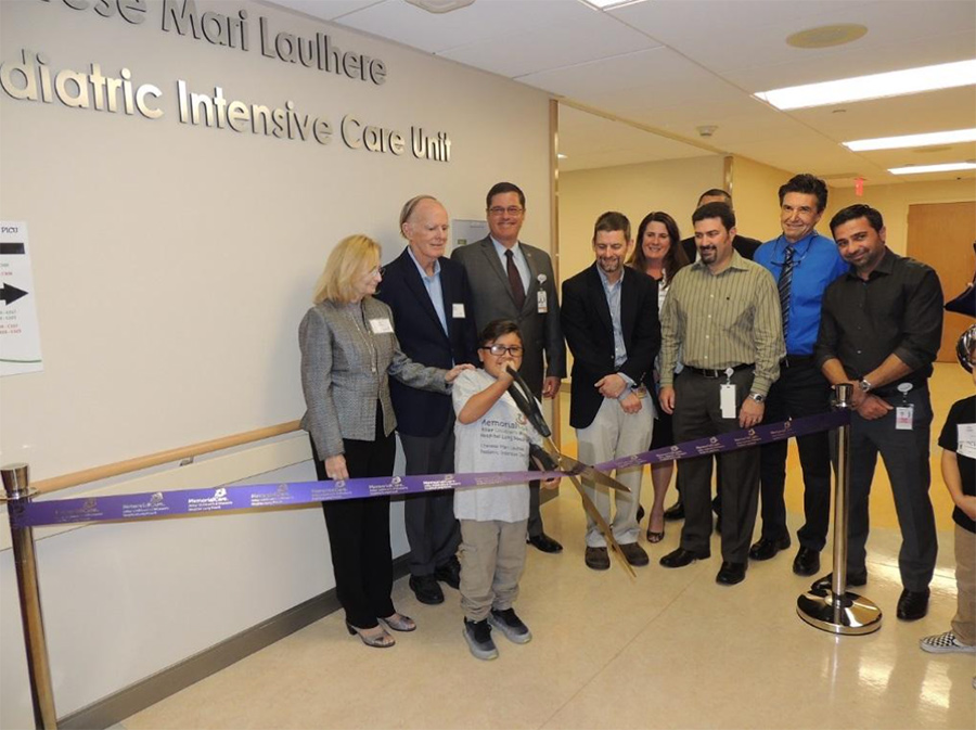 Former patient, Matthew, leads ceremonial ribbon-cutting to mark the final phase of renovations for the Cherese Mari Laulhere Pediatric Intensive Care Unit at Miller Children’s & Women’s, along with the Laulhere family, Miller Children’s & Women’s leadership and physicians.