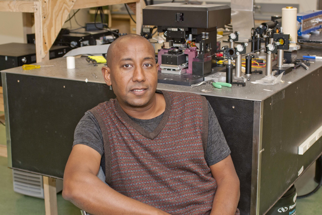 Originally from Ethiopia, Abate earned his bachelor’s degree at Addis Ababa University; his master’s at the University of the Philippines, Diliman; and his Ph.D. at the University of Iowa. He did his postdoctoral studies at UC Berkeley with Professor Stephen Leone, whom Abate called “one of the gurus of spectroscopy.” During Abate’s experiences at Berkeley and a brief period at the Max Planck Institute in Germany, he contributed to developing the technique that he uses today.