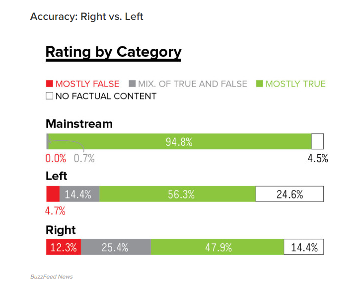 The analysis of hyper-partisan web pages concluded that, in contrast, three large left-wing pages published false or misleading information in nearly 20 percent of posts, while the three big right-wing Facebook pages published it 38 percent of the time.