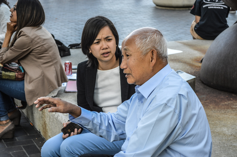 Two Khmer speakers discuss the importance of language access in front of City Hall earlier this year in April. Photo by Brian Addison.