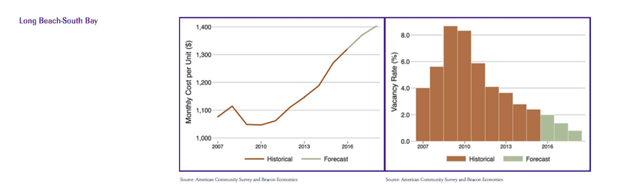 The report found that the county had the lowest vacancy rate of the four sub-regions (LA, Orange County, Riverside County, San Diego County) with only 4.2 percent of units available. In Long Beach that number was nearly half, with only 2.4 percent of rental properties open. However, the average rent in Long Beach fell short of the county average by about 40 dollars.