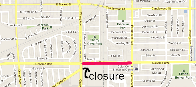 Though the closure is technically in and under the jursidiction of the City of Lakewood, it is right along the Long Beach border and has the potential to affect those traveling through that portion of Long Beach. Residents are encouraged to avoid these intersections if they can.