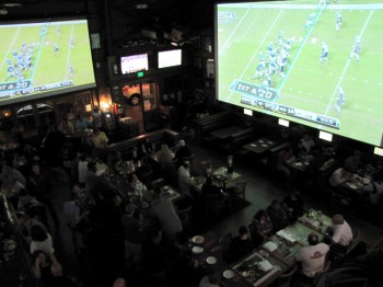 This shot of Legends in Belmont Shore shows both the old, 220-inch projection screen at left, along with the new, 326-inch projection screen, at right, that was installed about eight months ago. Photo by Ryan ZumMallen.