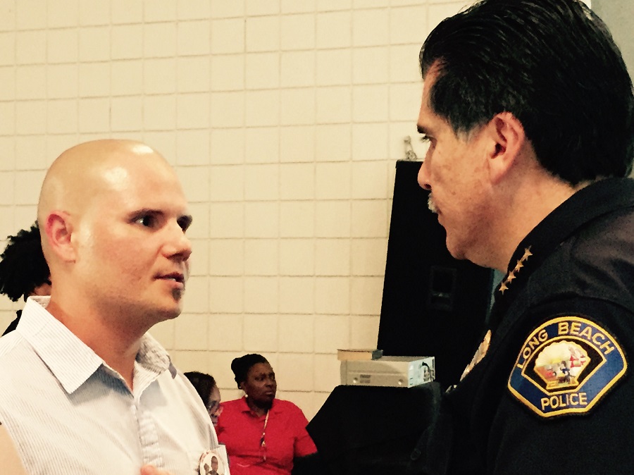 Long Beach Police Chief Robert Luna (right) speaks one-on-one with Ruben Morejon (left), the brother of Hector Morejon, an unarmed 19-year-old who was fatally shot by a Long Beach Police officer earlier this year. Photo by Jason Ruiz.