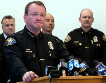 Long Beach Chief of Police Jim McDonnell addresses the media on Sunday the day after an officer was wounded. Photos by Daniel DeBoom